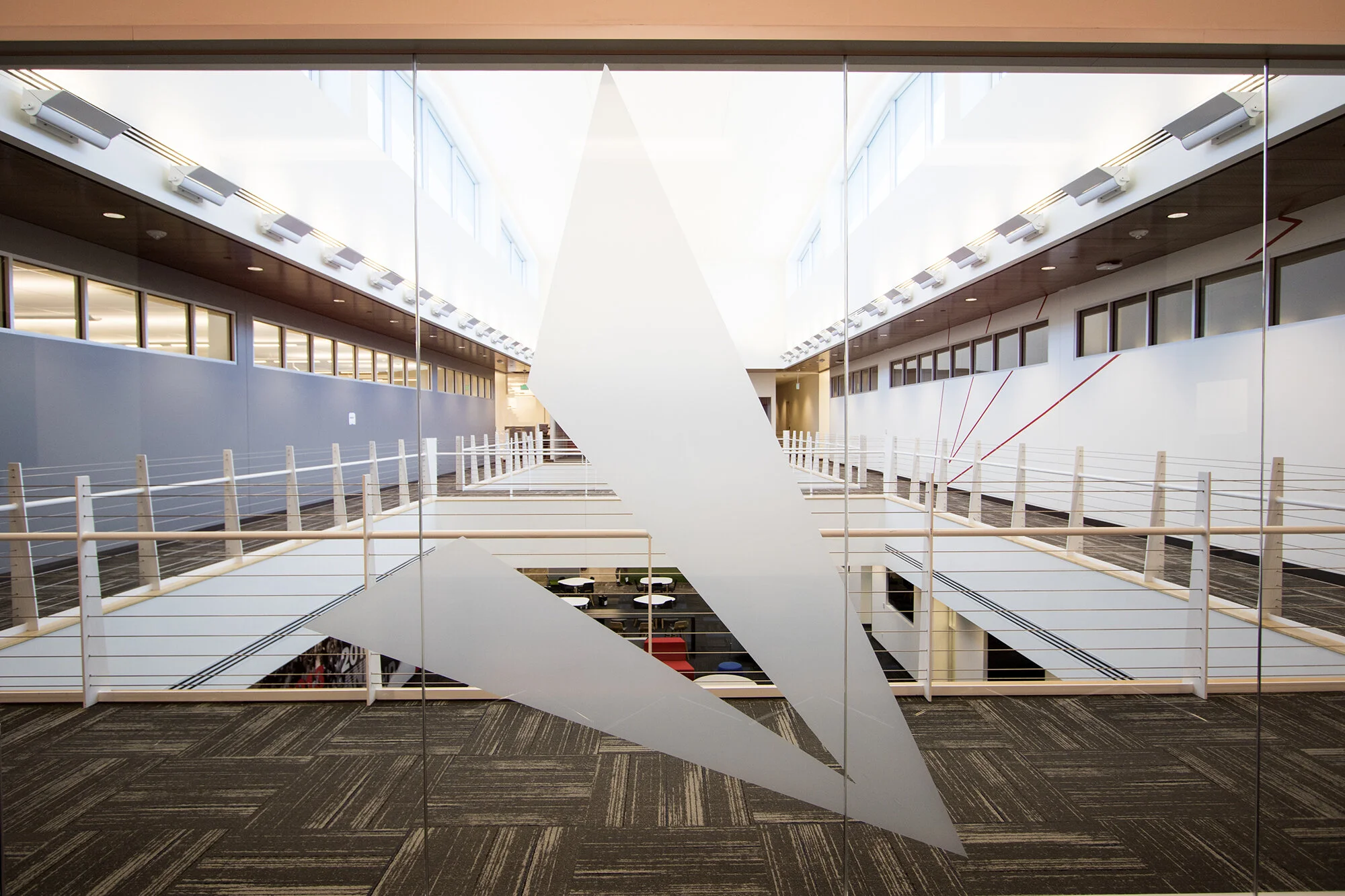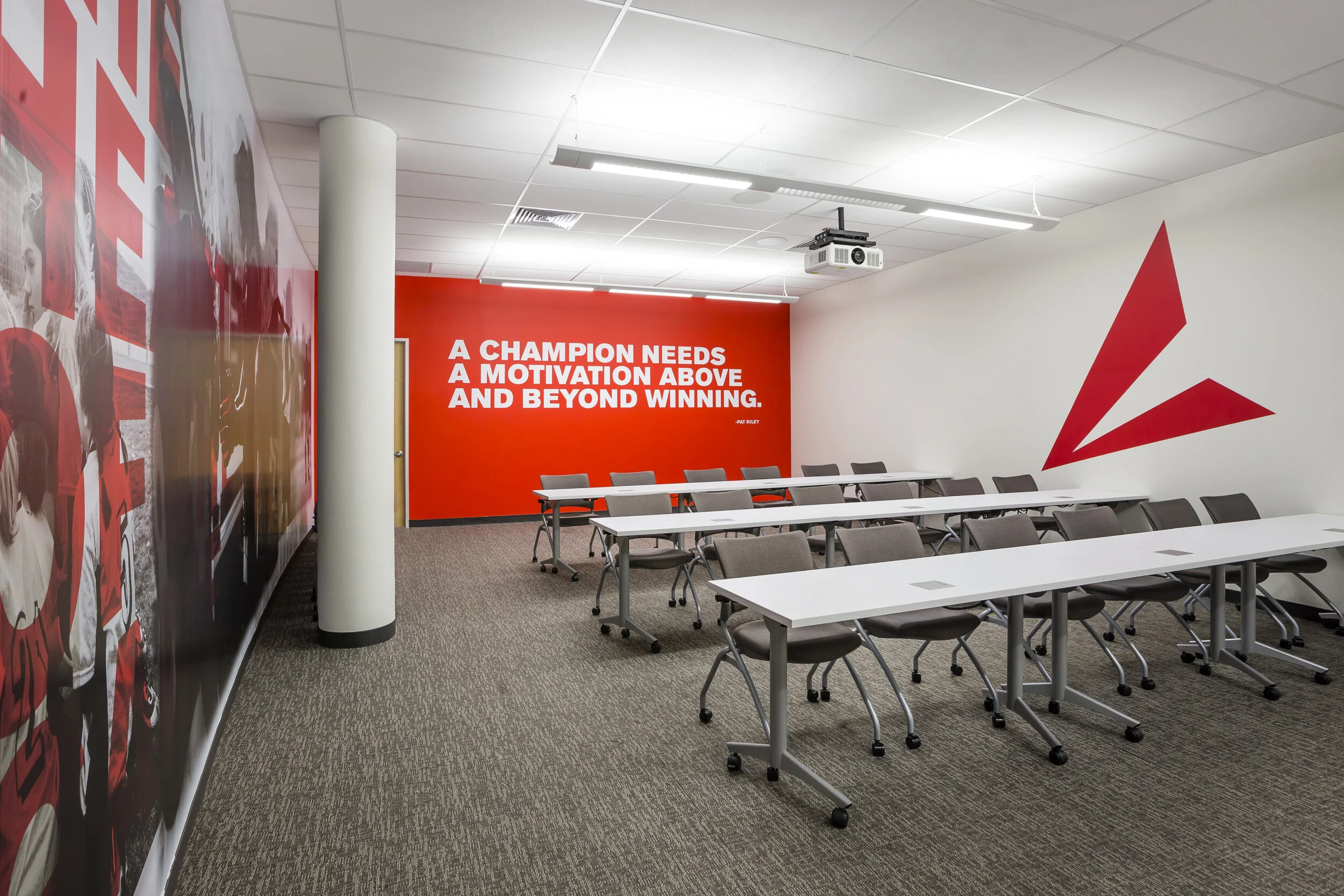 Varsity Brands is an apparel company focused on student sports and academics apparel. Made up of BSN Sports, Varsity Sport, Varsity Spirit, and Herff Jones, the entire space is inspired by the client’s tag line, “The Heart of the Game,” as well as student success and achievement. Elements such as the “Impact Room,” graphics, decorative lighting, integrated furniture, mannequin displays, dimensional quotes, a coaches gallery along a walking track, and a large feature wall in the atrium space provide visual reinforcement of their brand and constant reminders of why each employee’s role is critical to the success of their company.